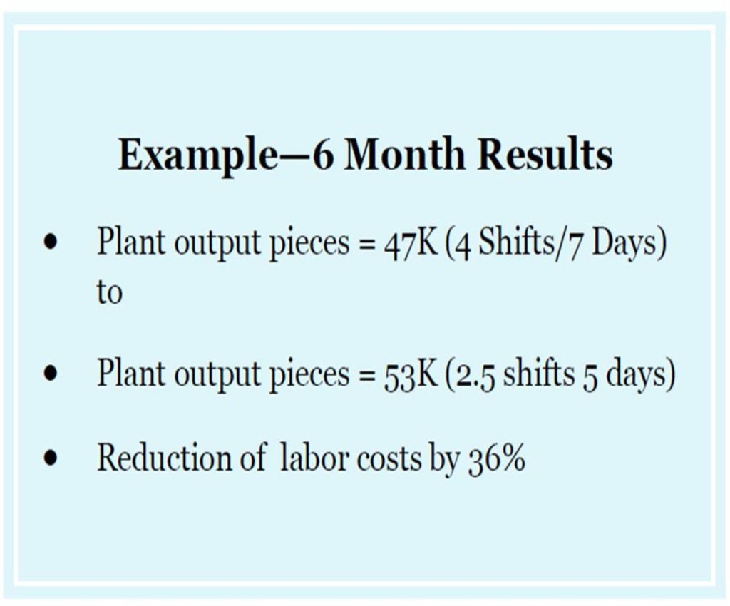 Our typical results are a minimum of $1,200,000 in cost savings within six months, on Production System implementations.